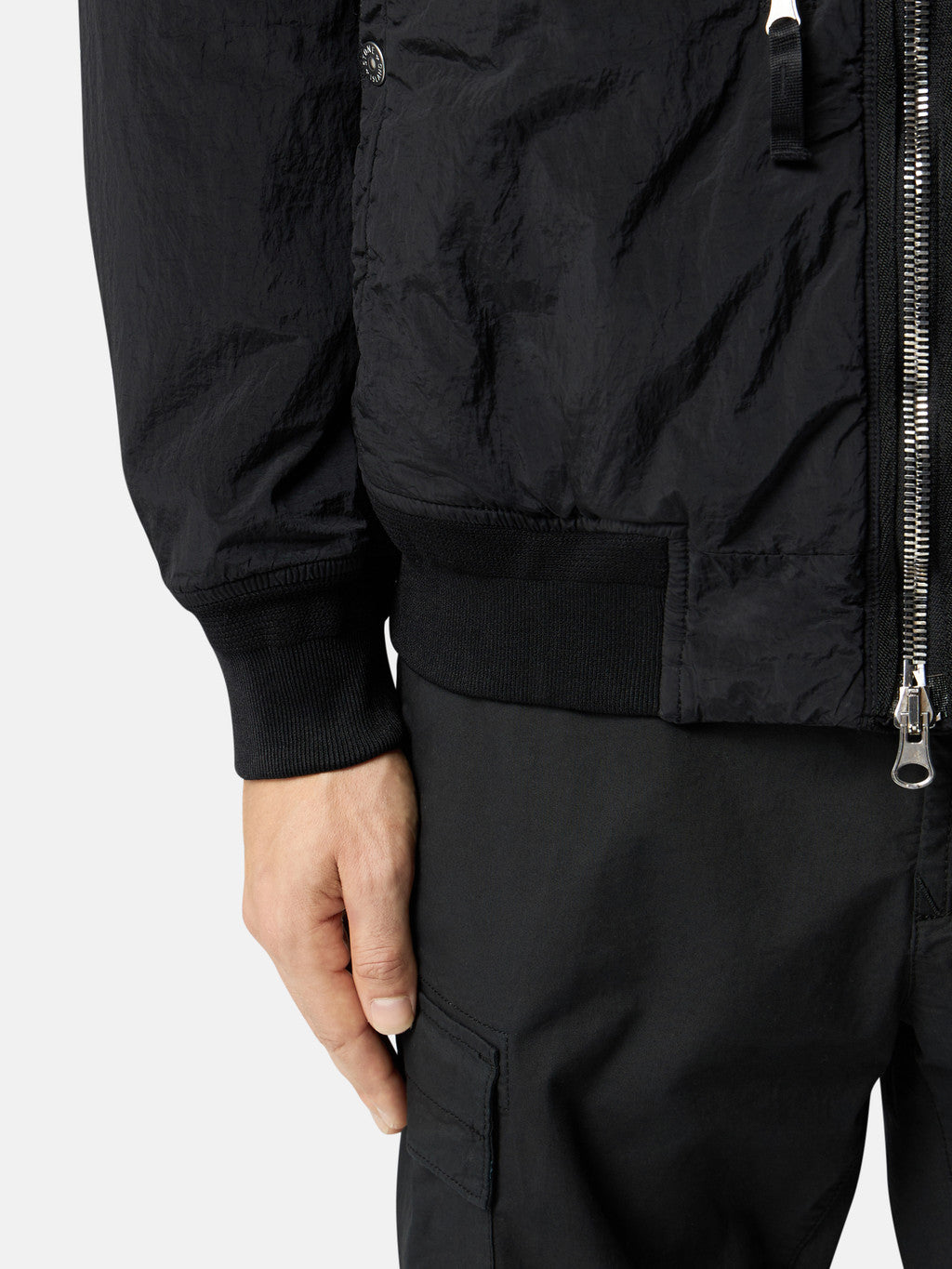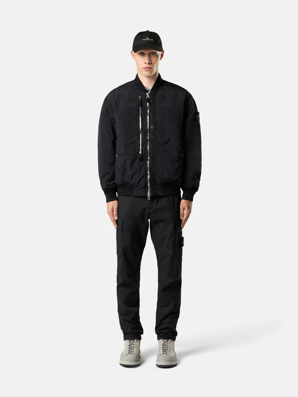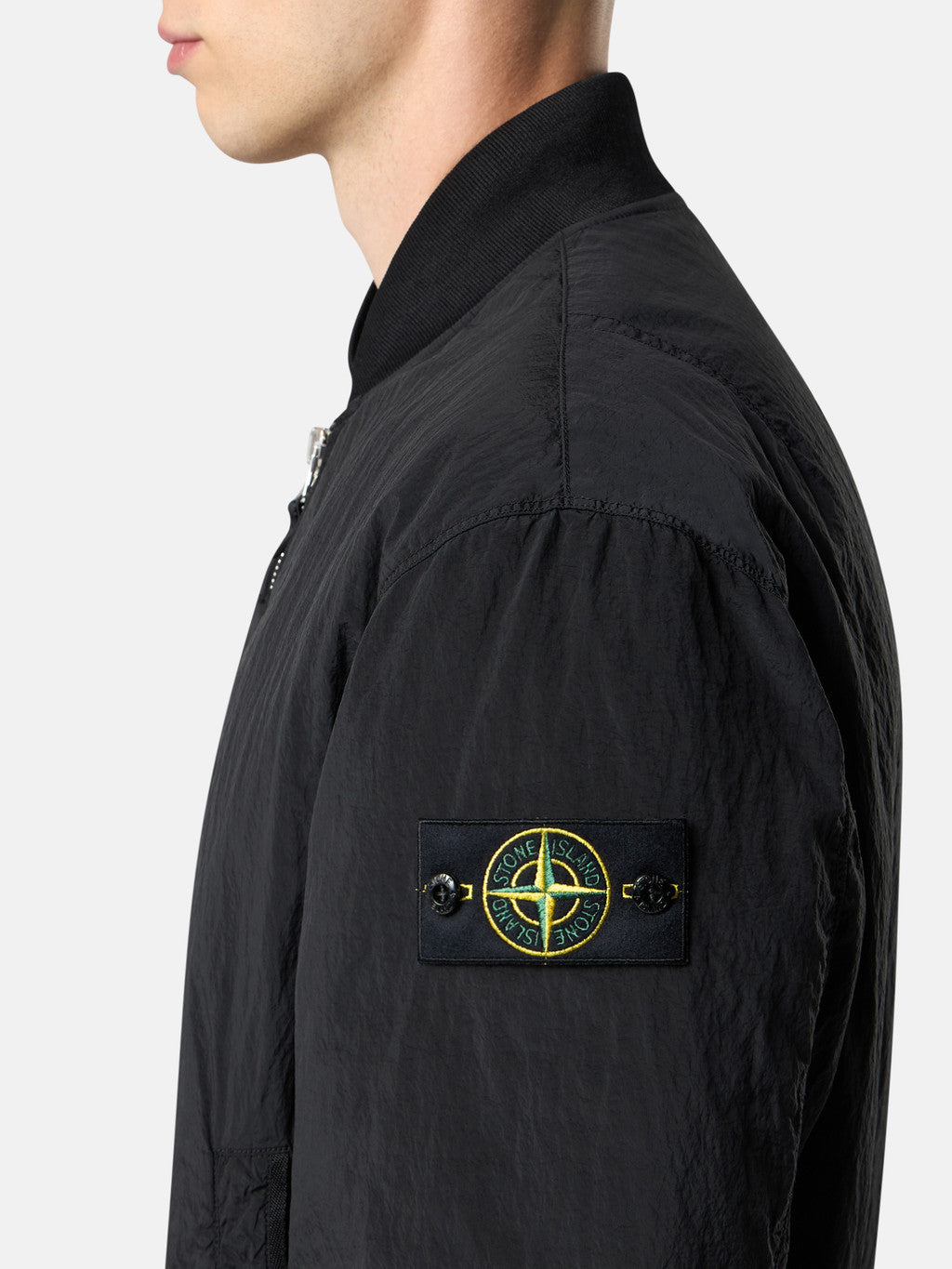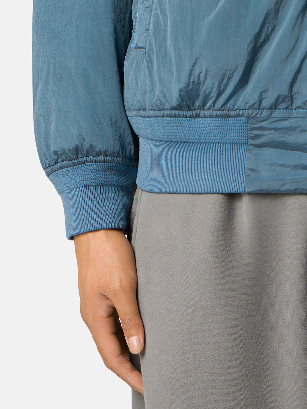 Bomber jacket in Stone Island's iridescent Nylon Metal fabric. The evolution of this iconic fabric sees the use of ECONYL regenerated yarns: the life ended nylon, pre- and post-consumer, is recycled with a complex depolymerization process to create this fibre that features the same intrinsic characteristics of nylon from fossil raw material. Garment dyed with a double colour recipe and the addition of a special anti-drop agent. Quilted inner layer padded with PrimaLoft .