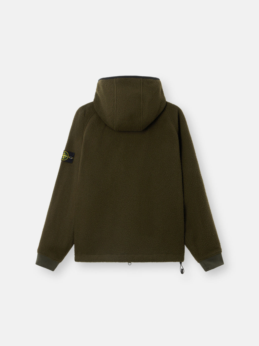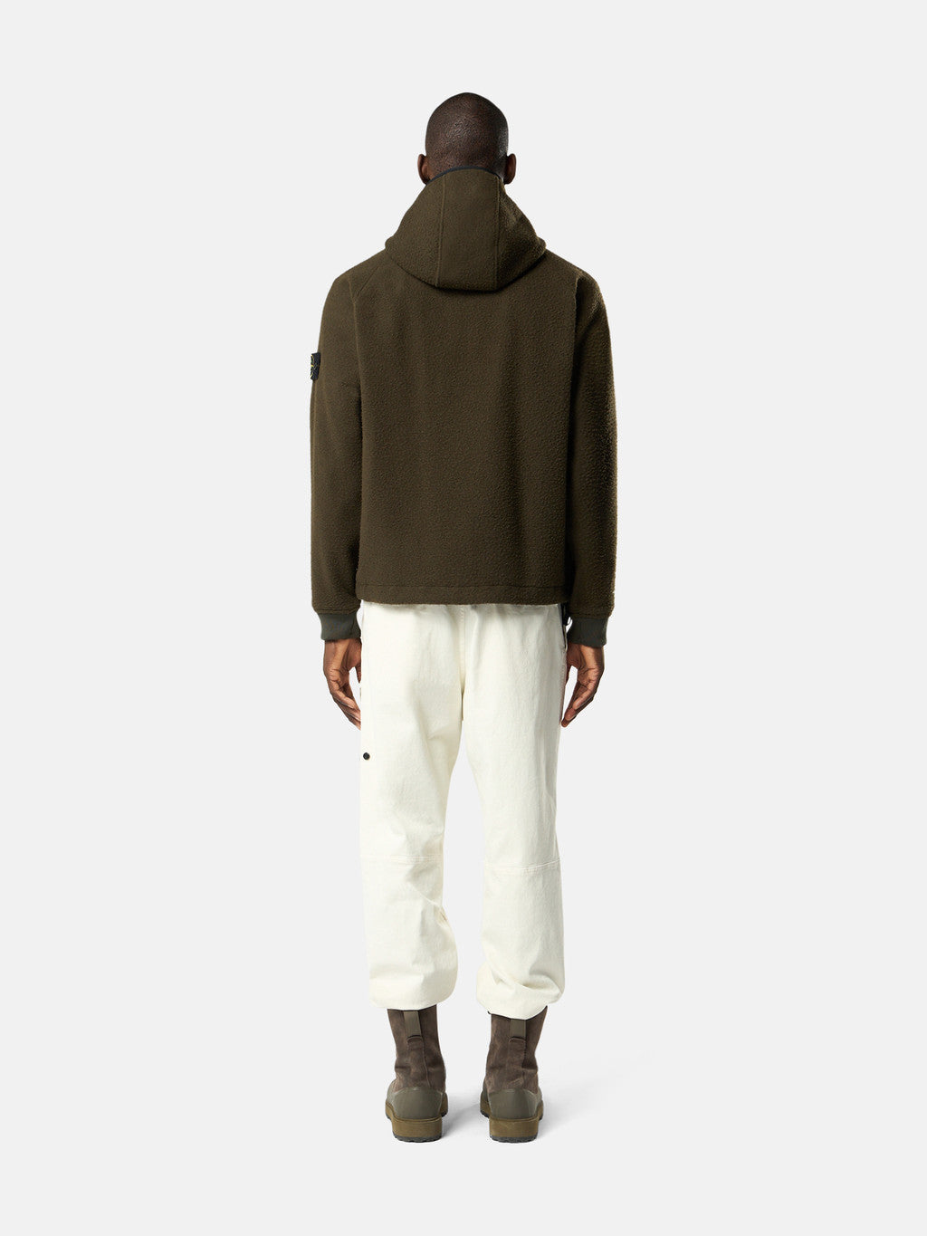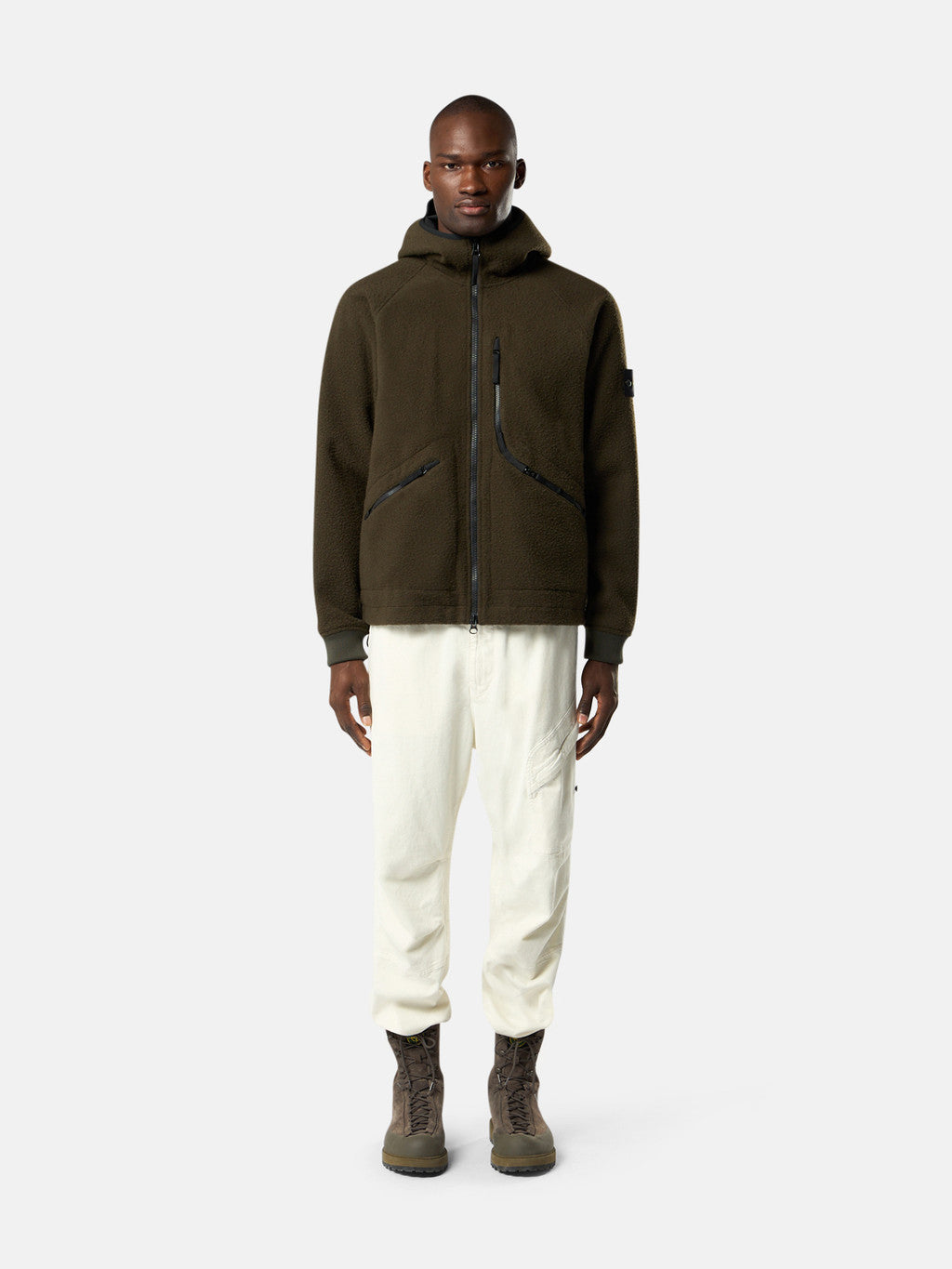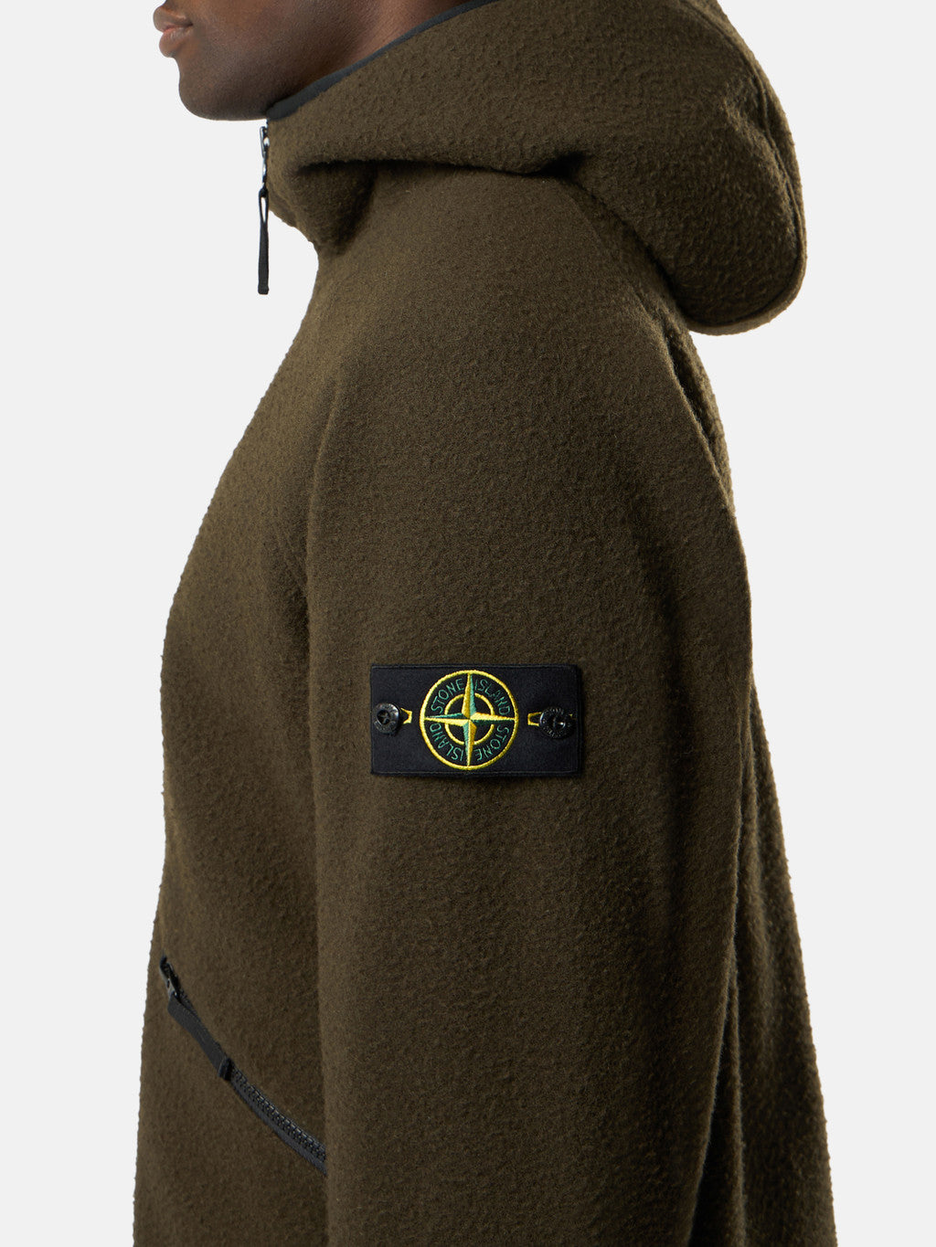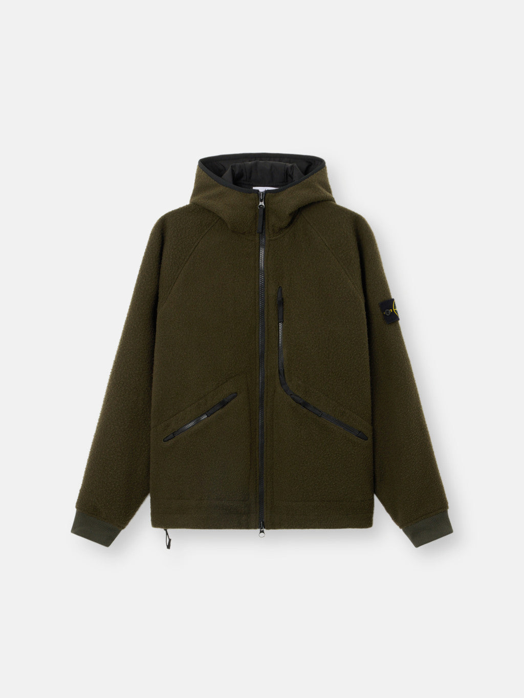 Hooded jacket made of a wool nylon cloth. The ratteen finishing process lends a characteristic knotted appearance to the surface. Treated with a specific anti-drop agent. Nylon ripstop lining.