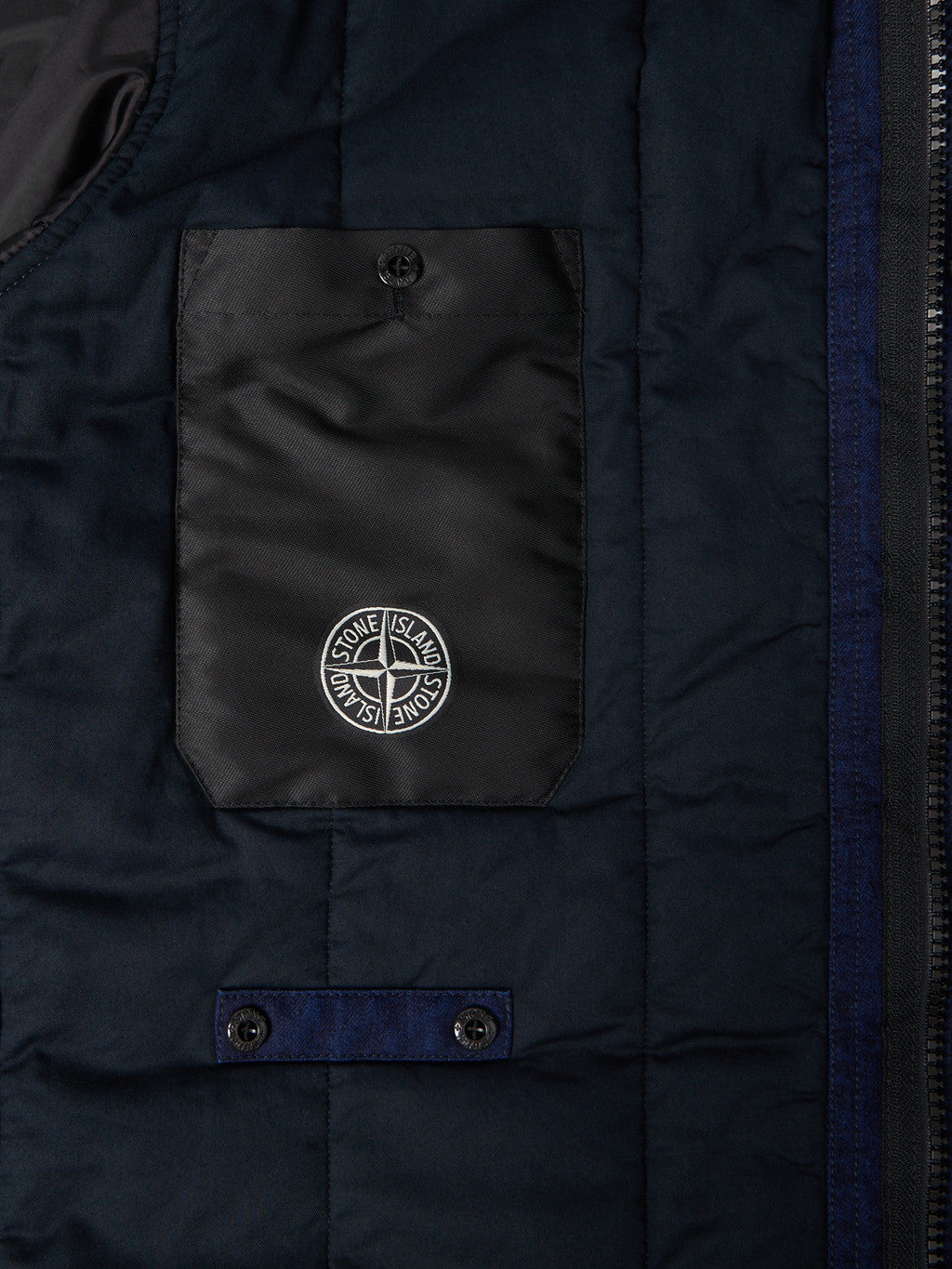 Polypropylene is one of the lightest fibres in existence, thanks in part to its hollow structure. Even very bulky garments made with this material are surprisingly light. Short parka made from an ultralight 7oz denim tela woven with a 3/1 twill weave composed of indigo-dyed cotton yarn and polypropylene yarn. The result is a denim with a traditional appearance, but significantly lighter in weight. The finished garment is rinsed. Lining with vertical quilting and padding.