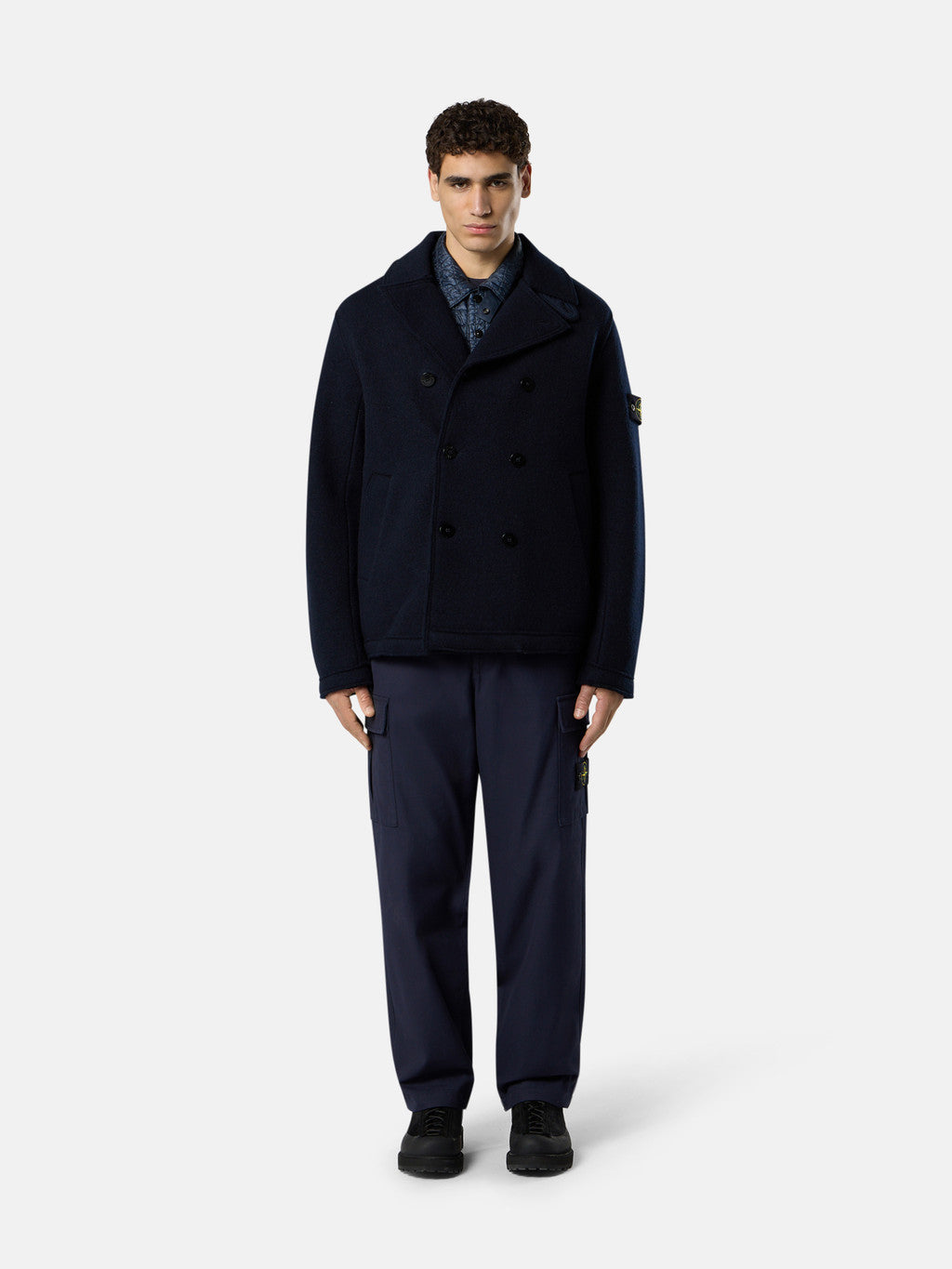 Double-breasted pea coat in felted RWS wool. Gauge 5.