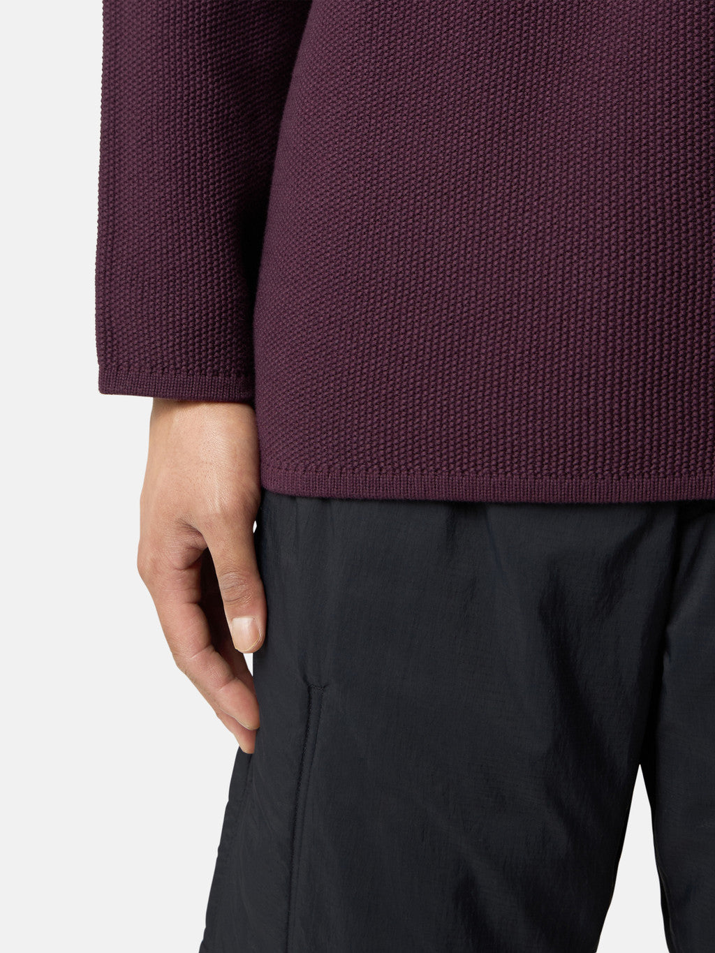 Knit mock neck jumper in cotton-nylon blend. Moss stitch. Gauge 7.