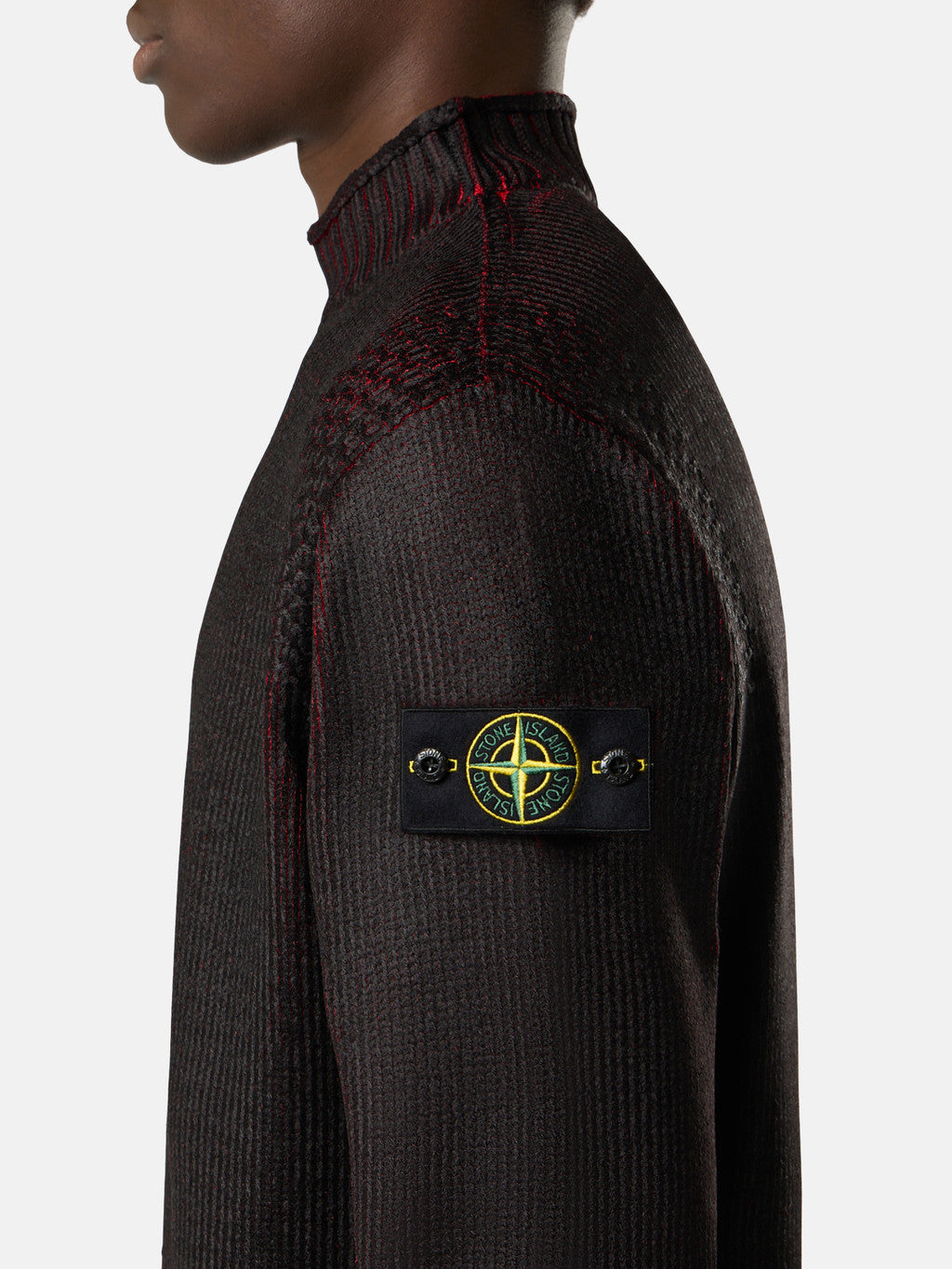 Knit mock neck jumper in stretch polyester-nylon blend with black sublimatic print. Gauge 3.