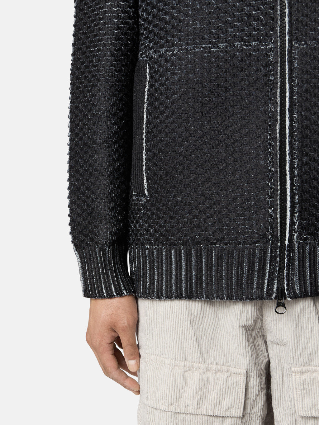 Knit zip-up jumper in stretch polyester-nylon blend with black sublimatic print. Gauge 3.