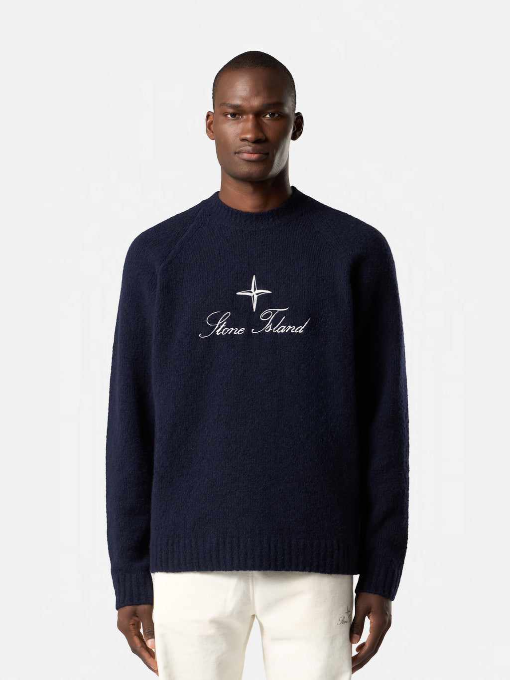 Knit crewneck jumper in wool nylon boucle. Stocking stitch. Gauge 5.
