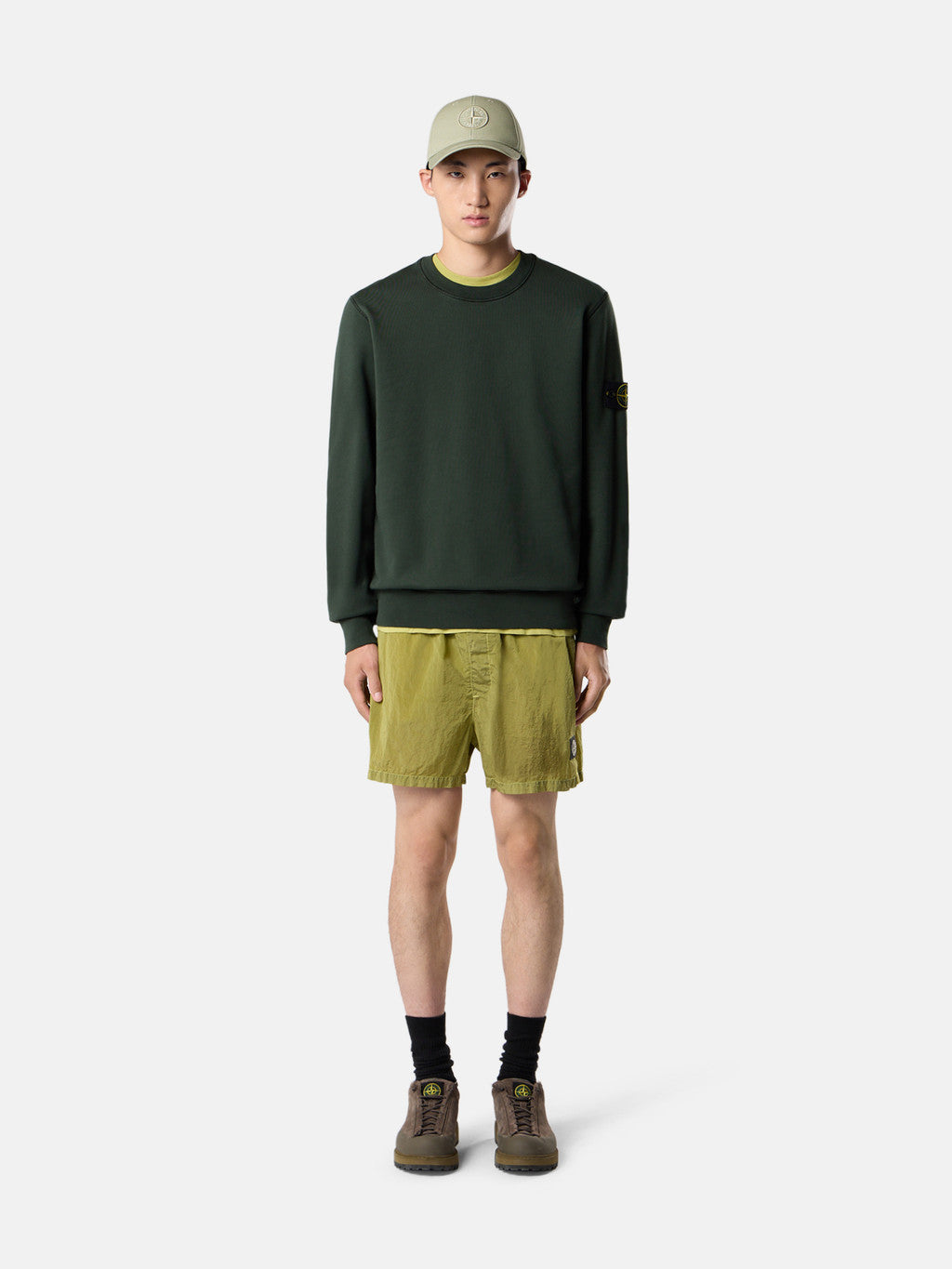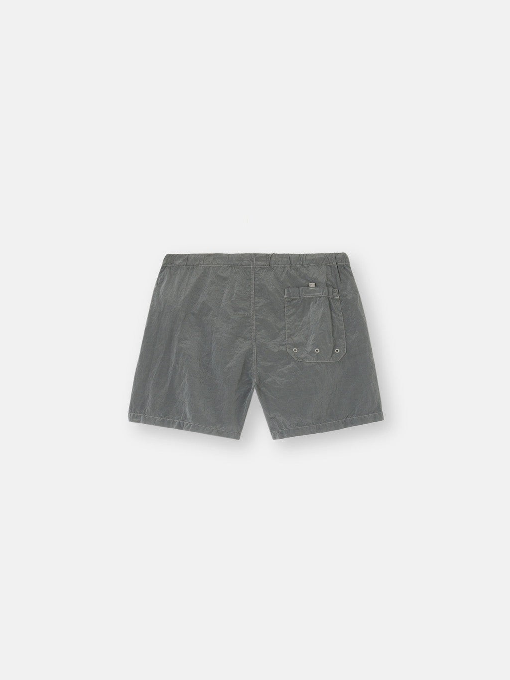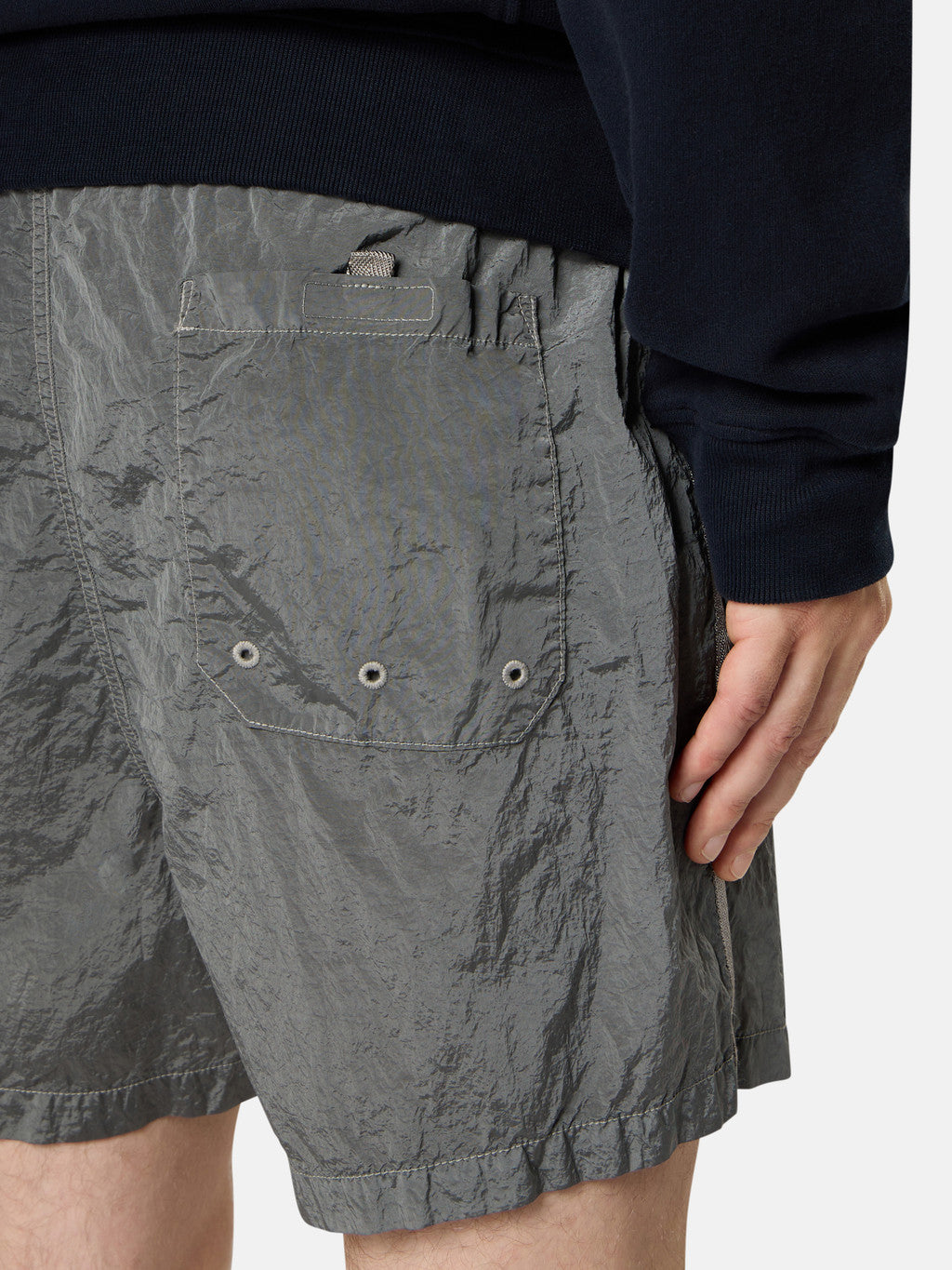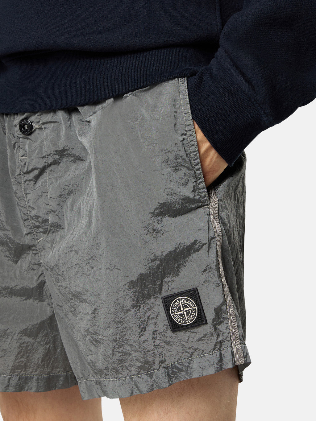 Swim shorts in Stone Island's iridescent Nylon Metal fabric. The evolution of this iconic fabric sees the use of ECONYL regenerated yarns: the life ended nylon, pre- and post-consumer, is recycled with a complex depolymerization process to create this fibre that features the same intrinsic characteristics of nylon from fossil raw material. Garment dyed with a double colour recipe. Nylon mesh lining.