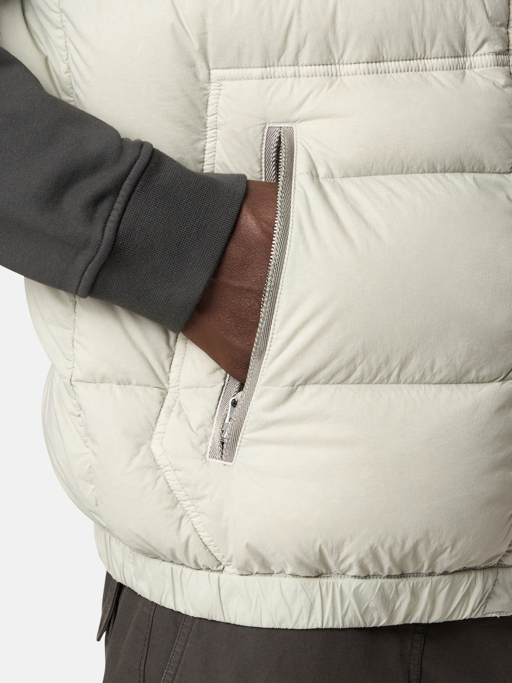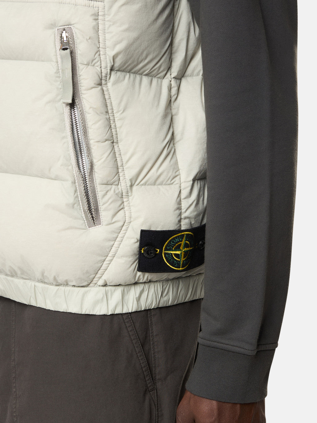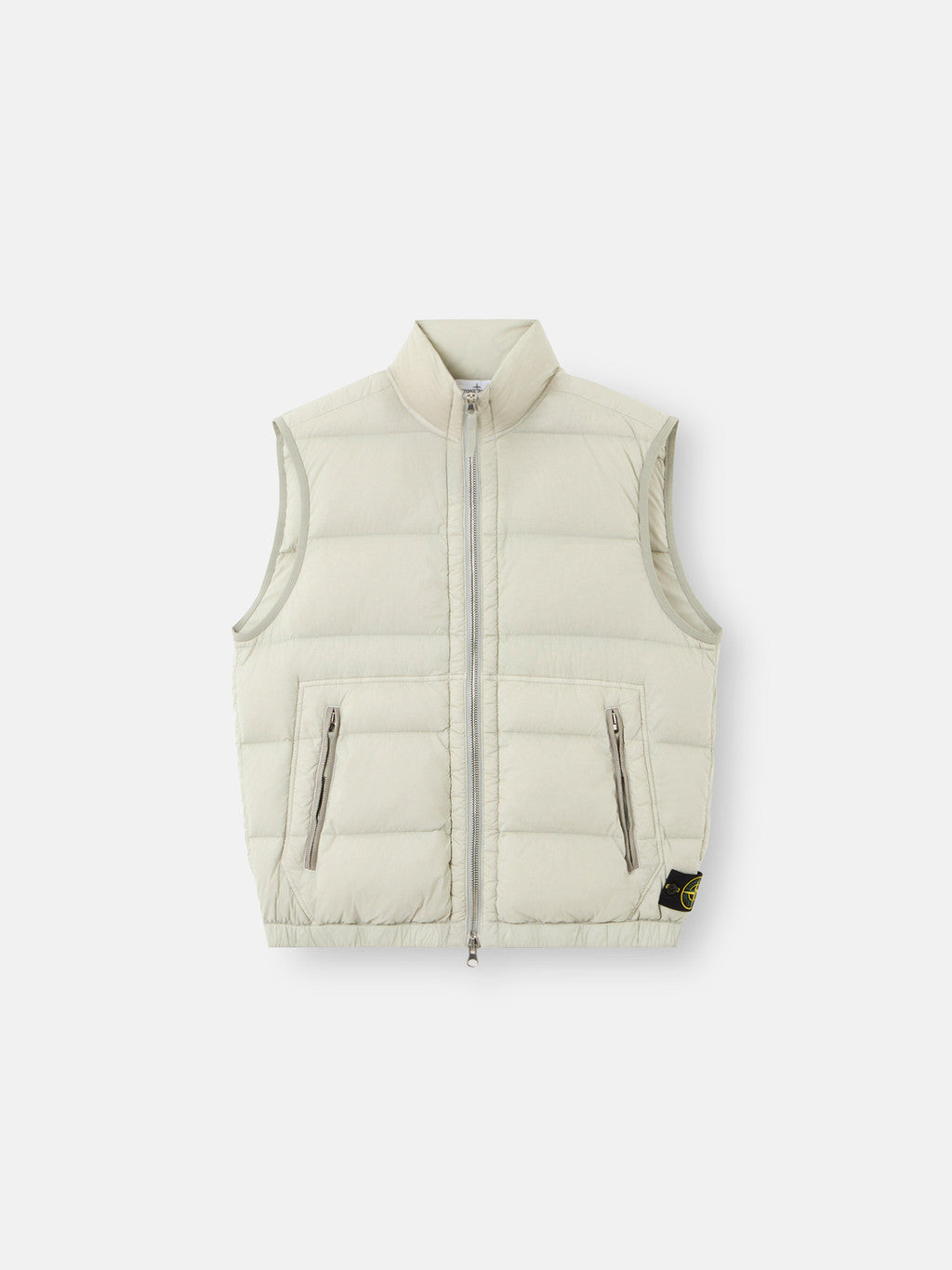 Down vest in a light stretch nylon single layer fabric undergoing a special weaving technique automatically creating the feather compartments directly from the loom. The seamless feather tunnels substantially increase the hold of the down. The finished garment is padded with direct injection with the finest feathers, specifically treated to resist garment dyeing. Garment dyed with the addition of a special anti-drop agent. RDS - Responsible Down Standard certified.