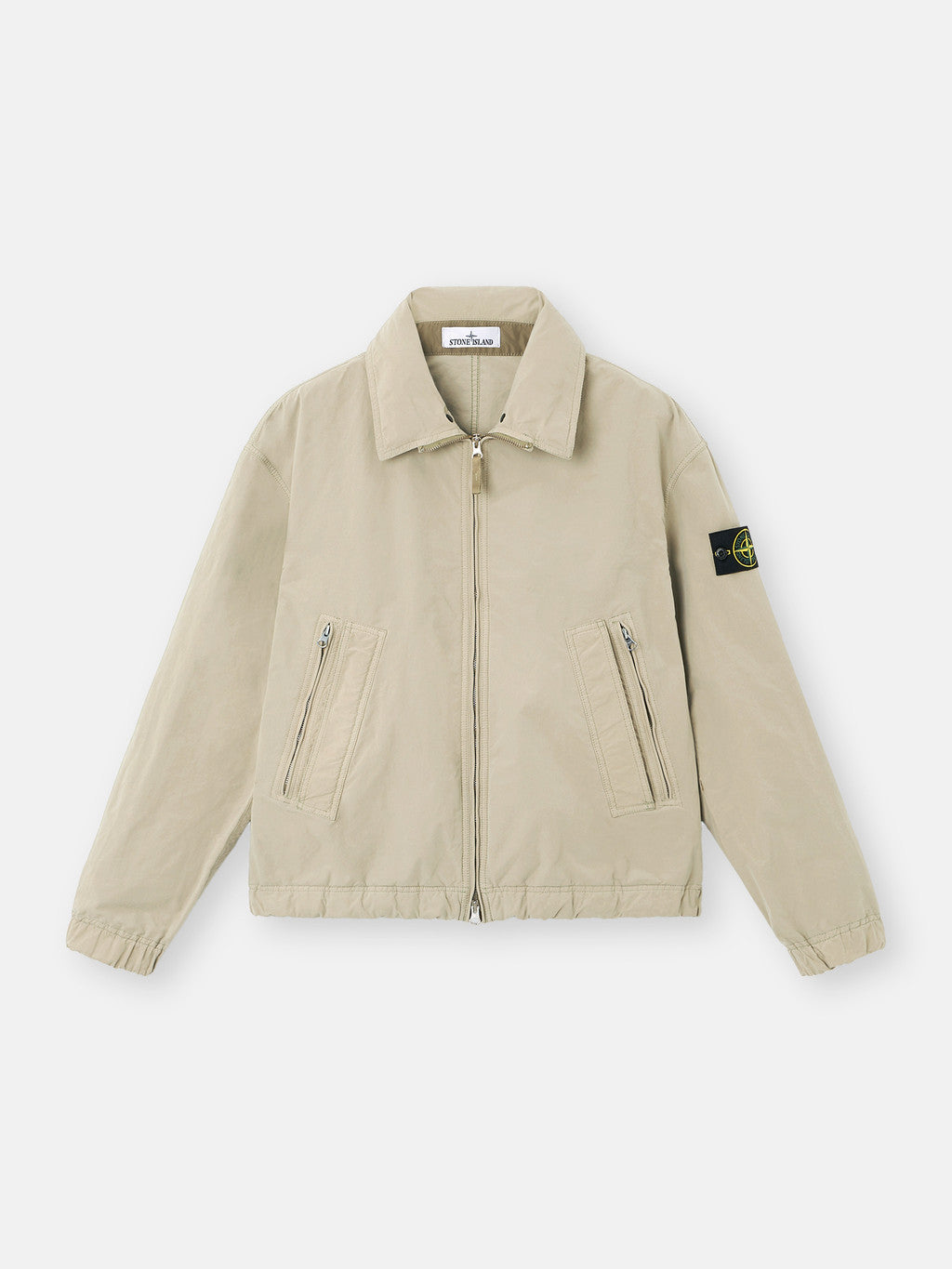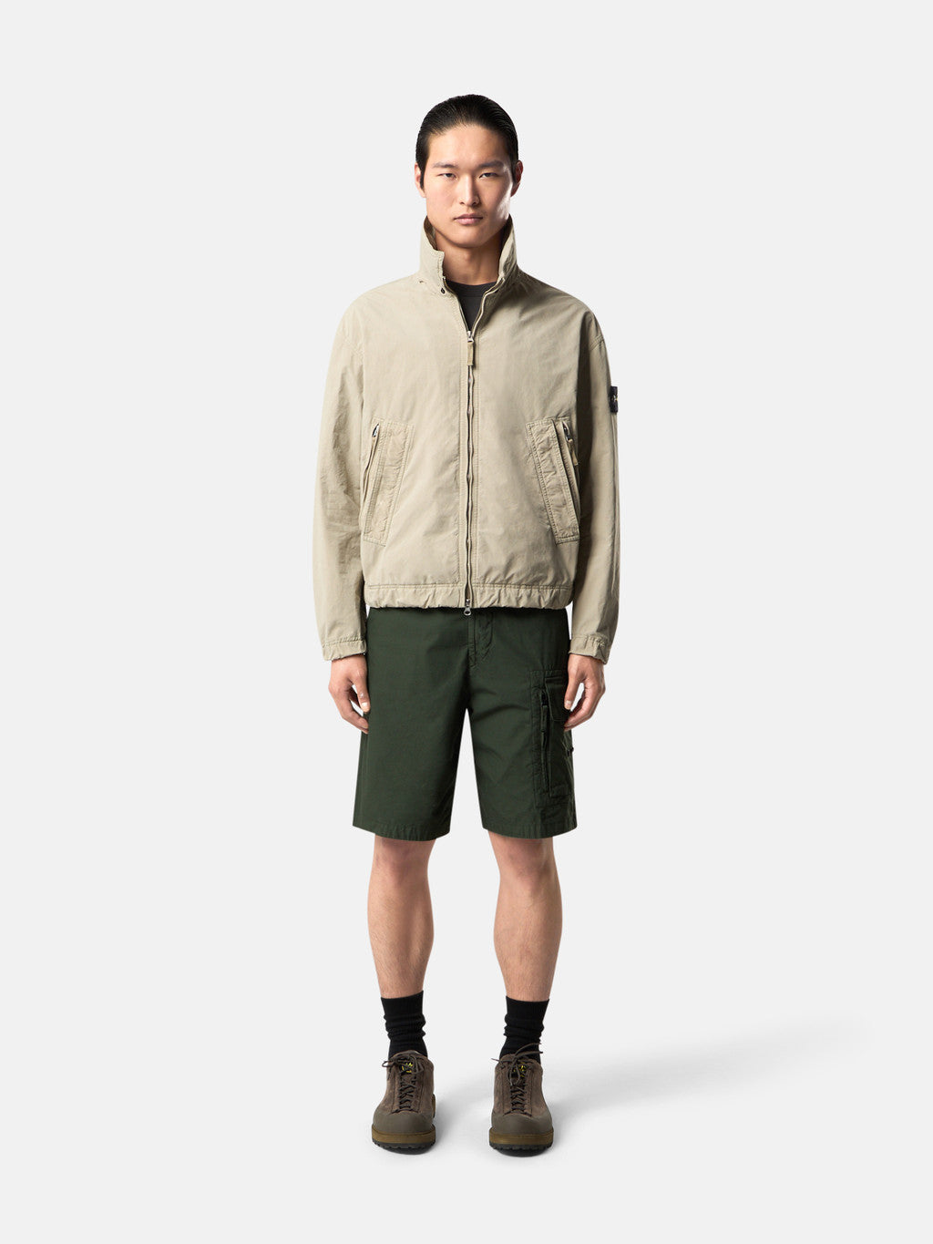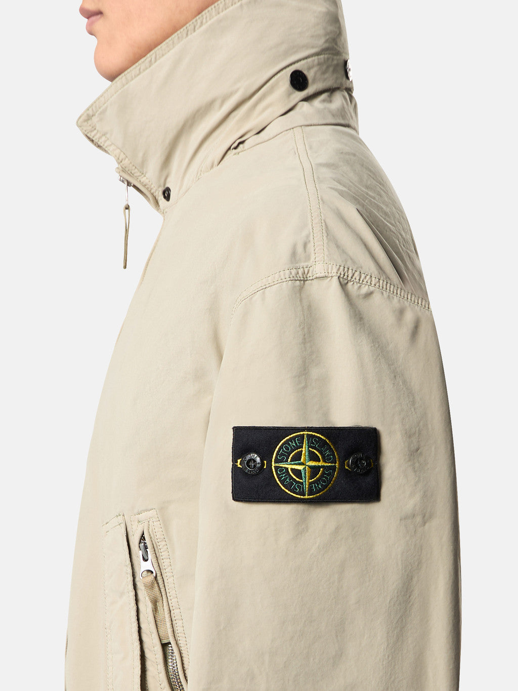 Shirt jacket in a lightweight tela made with Japanese star-shaped cross-section polyester/polyamide yarns. The pieces are assembled and then dyed under pressure at 130¡ãC with the addition of an anti-drop agent. During the garment dyeing process the heat radically transforms the material's hand and structure. The resulting garments combine an industrial appearance with a unique feel. Concealed hood.